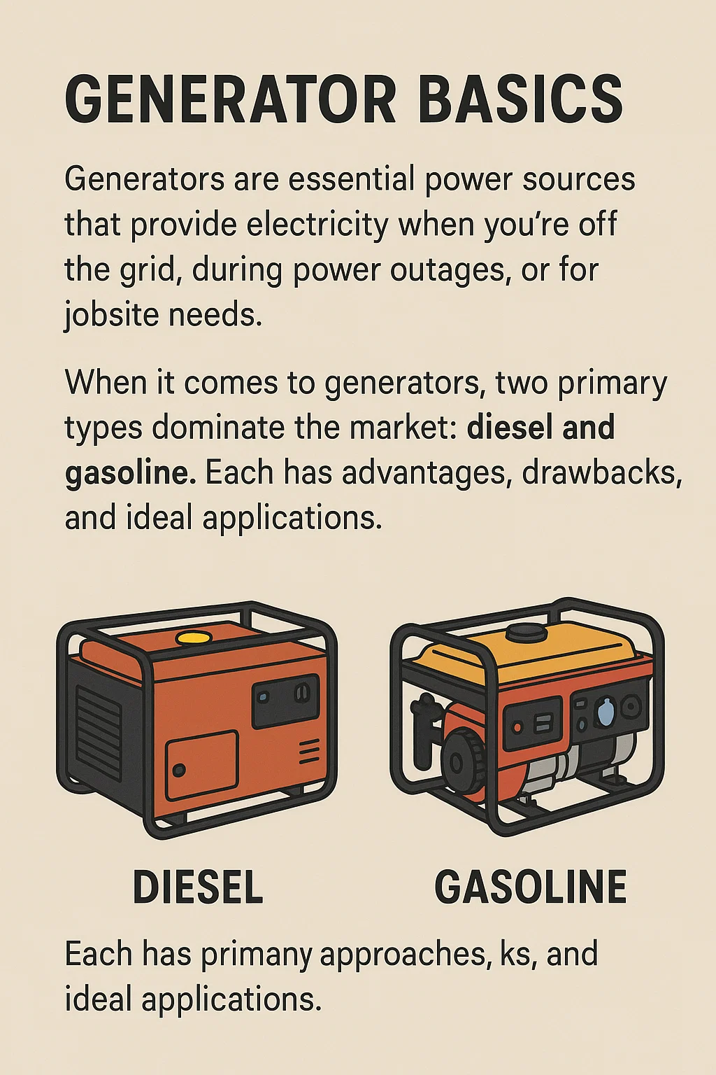 Pagdating sa mga generator, dalawang pangunahing uri ang nangingibabaw sa merkado: diesel at gasolina . Ang bawat isa ay may sariling hanay ng mga pakinabang, disbentaha, at perpektong aplikasyon. Ang pag-unawa sa mga pagkakaibang ito ay makakatulong sa iyong gumawa ng matalinong desisyon kung alin ang pinakaangkop sa iyong kapangyarihan.