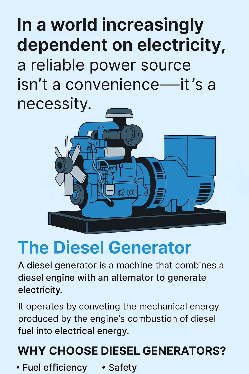 A generator ng diesel , o kapangyarihan generator , ay isang makina na pinagsasama ang a diesel makina na may isang alternator para makabuo kuryente . Ito ay nagpapatakbo sa pamamagitan ng pag-convert ng mekanikal na enerhiya na ginawa ng pagkasunog ng makina ng diesel panggatong sa elektrikal na enerhiya. Ang makapangyarihang mga makina na ito ay kilala sa kanilang tibay, kahusayan sa gasolina, at mahabang buhay, na ginagawa itong isang ginustong pagpipilian para sa isang malawak na hanay ng mga aplikasyon, mula sa residential backup hanggang sa pagpapagana ng buong lungsod.
